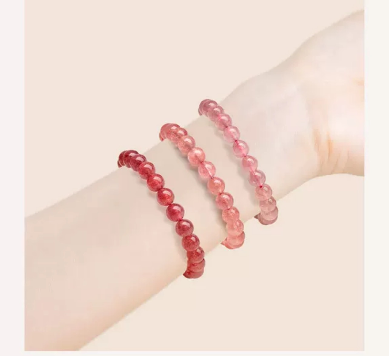 本商品は、厳選された高品質のストロベリークォーツを中心に、複数の天然石を組み合わせた多宝タイプのブレスレットです。